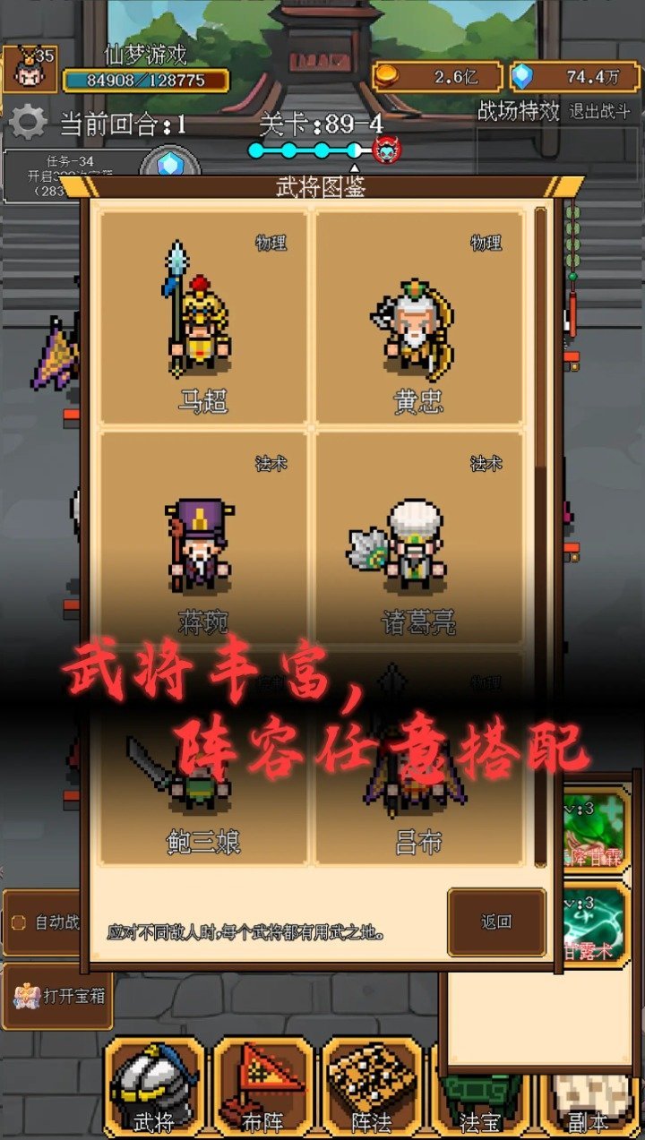 每个武将都有自己的特点和技能,玩家可以与这些英雄互动,收集并培养他们,提高他们的能力和属性。