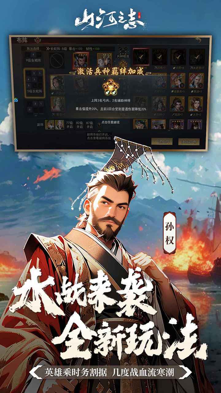 山河之志是一款非常经典的三国策略游戏,游戏以三国作为背景,开启属于你的三国世界,在这乱世中用自己的才智开拓属于自己的势力,招募强势的三国武将,训练军队,去开疆扩土,喜欢的玩家快来下载体验吧!